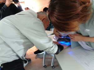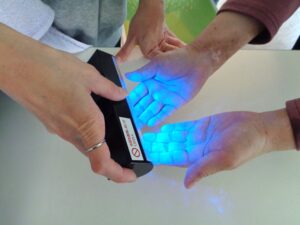 ブルーライトで可視化される特殊な液体を使用し、実際に手を洗ってどれだけ汚れが落とせているかを確認しました。