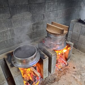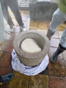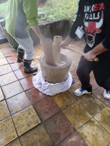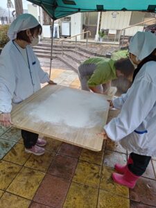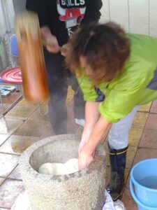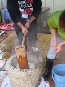 餅つきを行いました。 12月になりました。もうすぐお正月ですね。 恒例のおもちつきです!! 釜でもち米を蒸し、杵と臼を使った昔ながらの方法でついています。 みんなで大きなかけごえを掛けて 「それーっ!」 「わっしょい!」 「ぺったん!ぺったん!」 「もういっちょ!」 「はい、よーい!」 きれいなお餅の出来上がり。